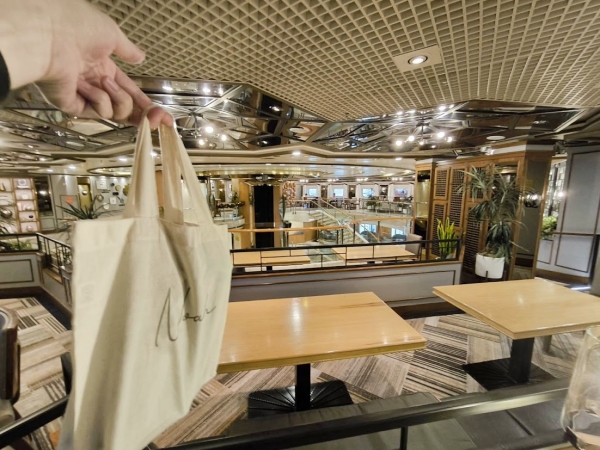 お世話になっているお店でいただいた記念ノベルティの袋のサイズがちょうどよすぎて、クルーズにも持っていき、世界一周させちゃいました。