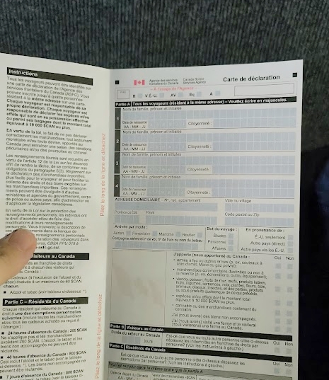 入国申請書。裏表(英語とフランス語)どちらかに記入。