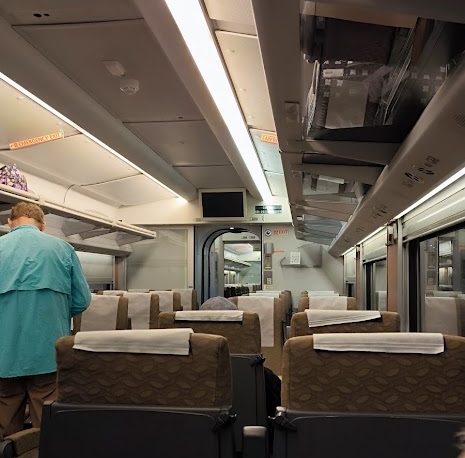 乗るとすぐに車内放送でコーヒーや軽食の販売について案内がありました。料金が高いビジネスクラスの車両の隣に車内販売車両があるようです。みんな朝食をゲットしようと我先に向かっており、長く待つことになりそうだったので静観します。