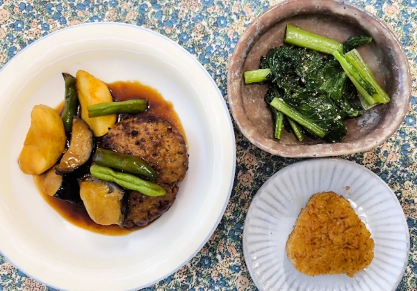 記念すべき1食目は、北海道じゃがいもと揚げなすのコク旨照り焼きハンバーグ。