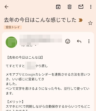 毎朝8時に、Googleカレンダーへ書いた去年のライフログがメールで届く。
