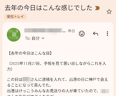 ・1年後の同じ日に「去年の今日はこんな日」メールが届いて日記が読める