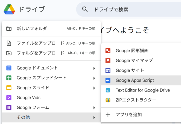 1. Googleドライブ →「新規」→「その他」→「Apps Script」を開く