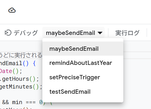 関数「testSendEmail」を選んで実行すると即メールが届きます。