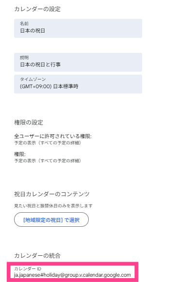 例として「日本の祝日」のIDを確認する手順を載せます(※自分のカレンダーのIDを確認してね!)。